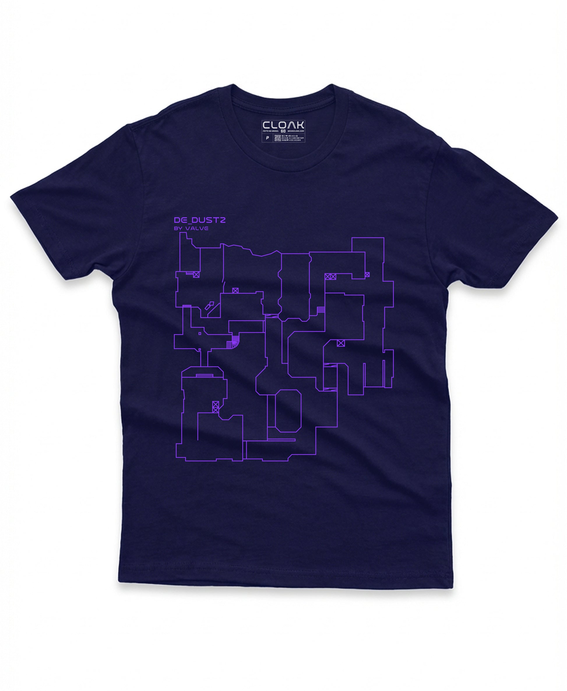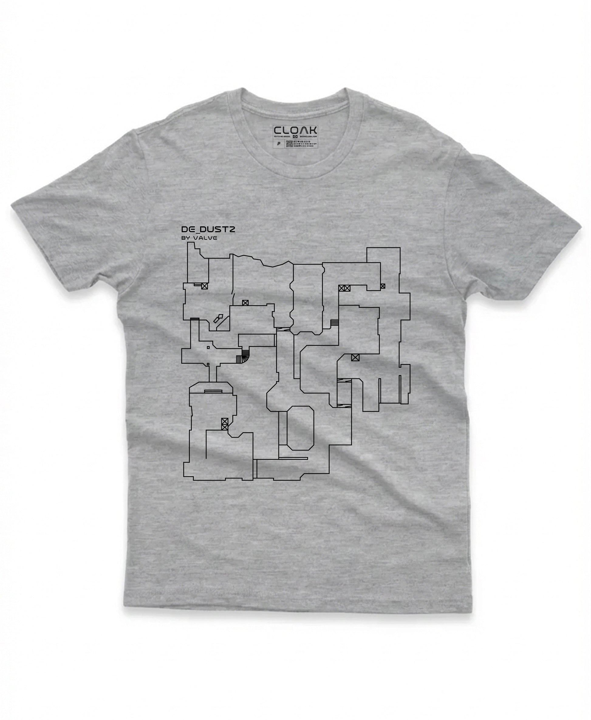 A camiseta DUST2 é a homenagem definitiva para o jogador que vive e respira a estratégia. O design é uma planta baixa minimalista e elegante do mapa mais icônico do Counter-Strike, destacando as callouts essenciais (Long A, B Site, Mid) de uma forma que só o insider reconhece.
